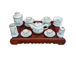 Bộ ấm chén men kem - hoa đào xanh - đầy đủ phụ kiện và khay gỗ hương